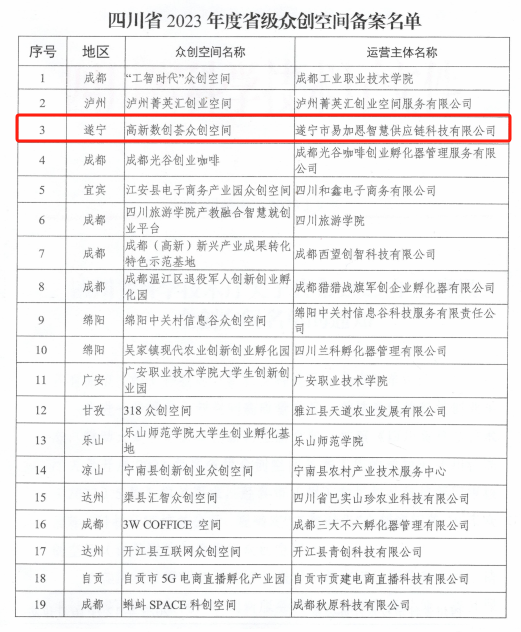 小编从四川省科学技术厅获悉,为进一步推动众创空间高质量发展,营造良好的科技创业生态,推动大众创业万众创新再上新台阶,按照《四川省科学技术厅关于开展2023年度省级众创空间备案工作的通知》(川科高〔2023〕5号)相关要求,经各市(州)和扩权县科技部门审核推荐,科技厅审核并公示,现确定高新数创荟众创空间等19家众创空间为省级众创空间。