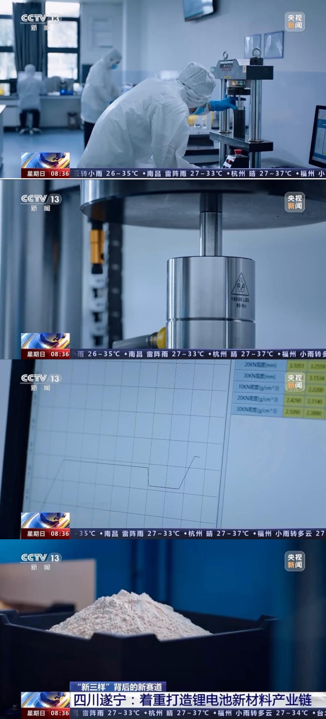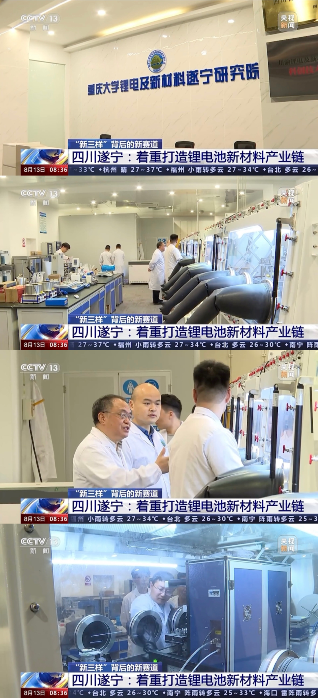 8月13日上午,中央电视台新闻频道《朝闻天下》在“‘新三样’背后的新赛道”专题新闻中播出《四川遂宁:着重打造锂电池新材料产业链》,关注重庆大学锂电及新材料遂宁研究院。