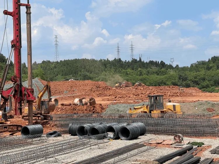 5月21日,遂宁市市本级兴业保障性租赁住房(人才公寓)建设项目现场,旋挖钻机正紧张作业,工人们有序进行钢筋绑扎。