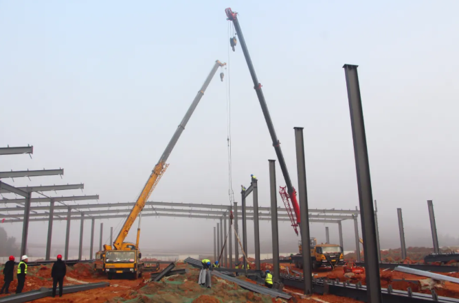 塔吊来回升降、设备不停运转、工人有序忙碌……1月19日,记者走进泳泉智能玻璃深加工项目(一期)建设现场,只见工人、机械齐上阵,三台“机械手臂”——直臂式高空作业车,正将一条条加工好的钢结构零件吊起,缓缓移到钢结构桩基上面,由工人们进行安装。