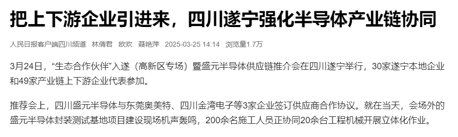 推荐会上,四川盛元半导体与东莞奥美特、四川金湾电子等3家企业签订供应商合作协议。就在当天,会场外的盛元半导体封装测试基地项目建设现场机声轰鸣,200余名施工人员正协同20余台工程机械开展立体化作业。
