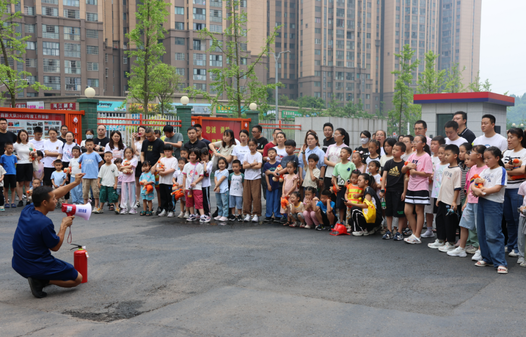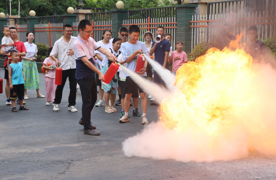 在消防体验环节,小朋友们参观了消防员生活区域,消防员现场演示了灭火救援服和抢险救援服的穿戴方法,展示了绳索攀爬上四楼课目,讲解了灭火器“提拔握压”四字口诀,并进行灭火实操。随后,现场的几位干部职工及其子女在消防员指导下,亲身实践了干粉灭火器使用方法。