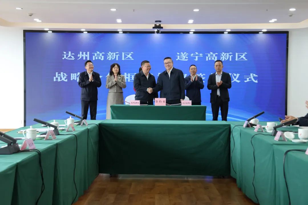 仪式现场,遂宁高新区管委会与达州高新区管委会签订战略合作协议,双方将发挥区位、交通、资源、政策、经验等方面的优势,加强资源整合和共享,加快形成服务“成渝地区双城经济圈”及“陆海新通道”建设的现代物流体系和合作创新模式。