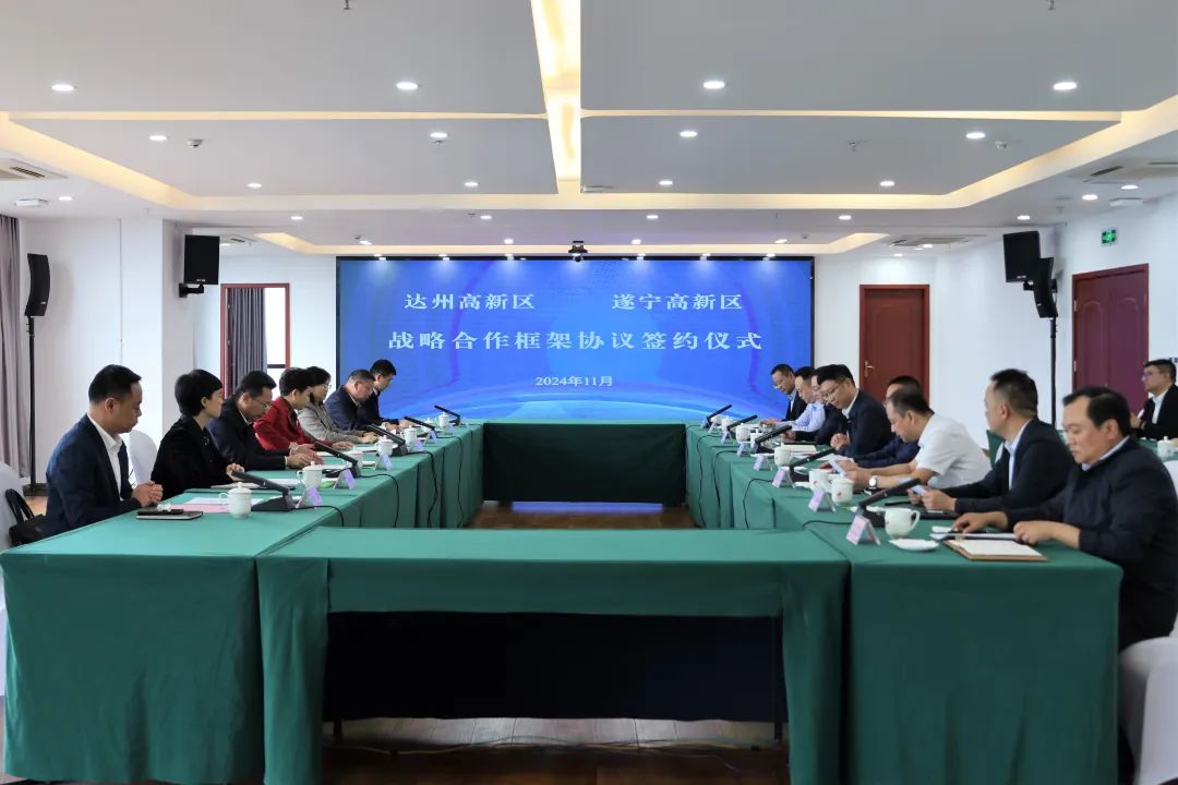 11月1日,遂宁高新区与达州高新区举行战略合作框架协议签约仪式,进一步加强两区联动发展,促进两地要素资源自由流动,助推两地枢纽经济发展迈上新台阶。达州市副市长唐志坤、遂宁市副市长张智勇出席签约仪式并讲话。达州市政府副秘书长、市机关事务服务中心主任孙曼妮,达州市商务局局长牟道勇,达州市商务局副局长蒲雨阳,达州高新区党工委副书记、管委会主任张顺超;遂宁市政府办公室副主任罗红光,遂宁市商务局局长杨东,遂宁高新区党工委副书记、管委会主任唐统参加仪式。