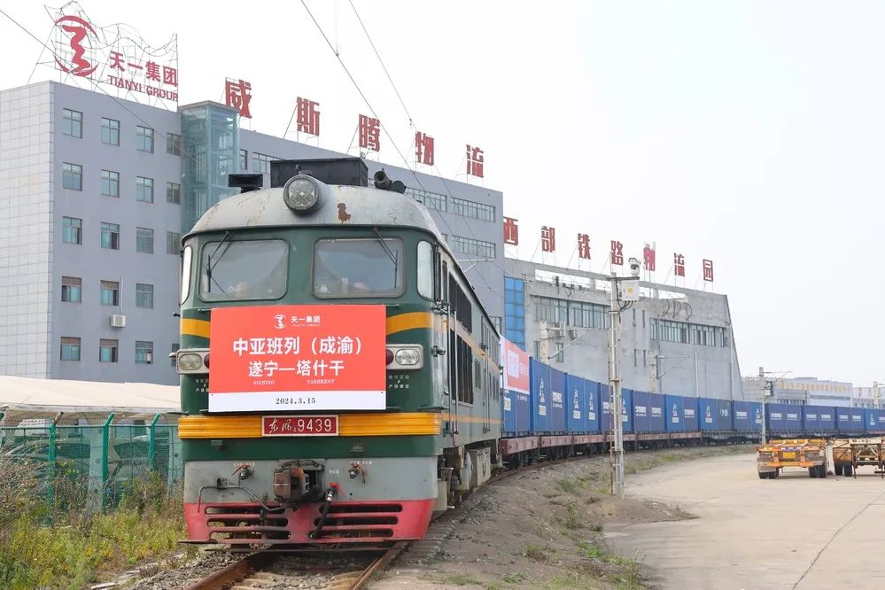 2024年3月15日,遂宁市首趟中亚班列从遂宁高新区西部铁路物流园缓缓驶出,进一步畅通国内国际双循环。