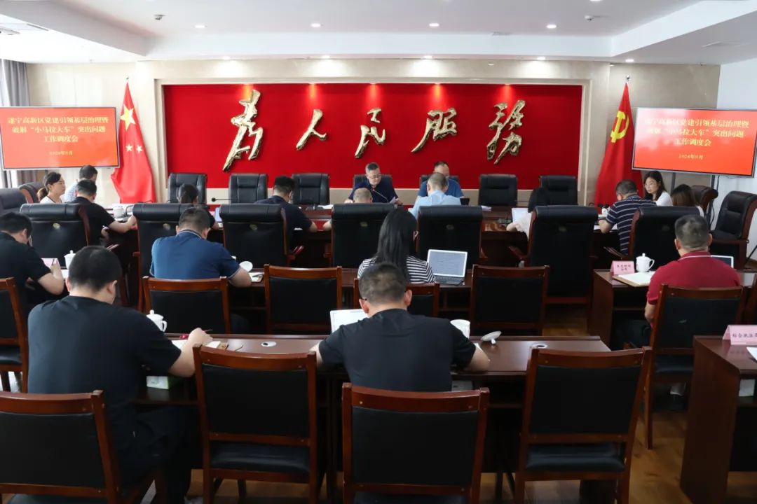 9月14日,遂宁高新区召开党建引领基层治理暨破解“小马拉大车”突出问题工作调度会,传达学习中、省、市有关会议精神,听取相关工作情况汇报,安排部署下步重点工作。遂宁高新区党工委副书记、管委会主任唐统主持会议并讲话。园区领导谭勇参加会议。