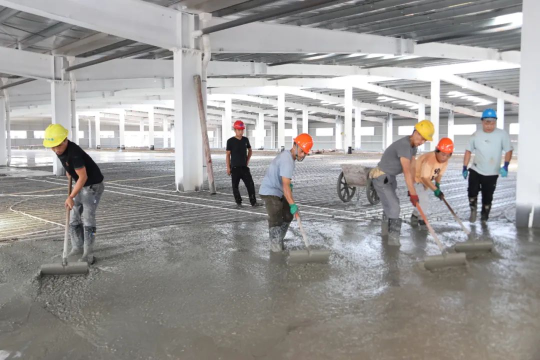 9月11日上午,记者在海滋食品加工生产基地项目建设现场看到,5个单体建筑拔地而起,10余辆挖掘机、渣土车、混凝土泵车等机械设备穿梭其间,60余名工人分散在各个区域有序开展焊接、浇筑混凝土等作业,现场一派热火朝天。