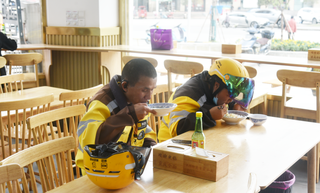 “正常时间我们要给人家送饭,所以吃上午饭往往都下午2点了,很多店这个时候都关门休息了。”张俊告诉记者,找到吃饭方便快捷,同时不耽搁送餐的饭馆,是大家的共同需要,而“暖心食堂”恰好满足了以上两点。