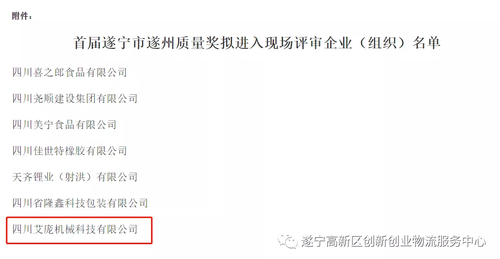 根据首届遂宁市遂州质量奖评选工作安排,按照《遂宁市遂州质量奖评选管理办法》(遂府办发〔2021〕7号)相关规定,经专家组资料审查,四川艾庞机械科技有限公司进入首届遂宁市遂州质量奖现场评审名单。