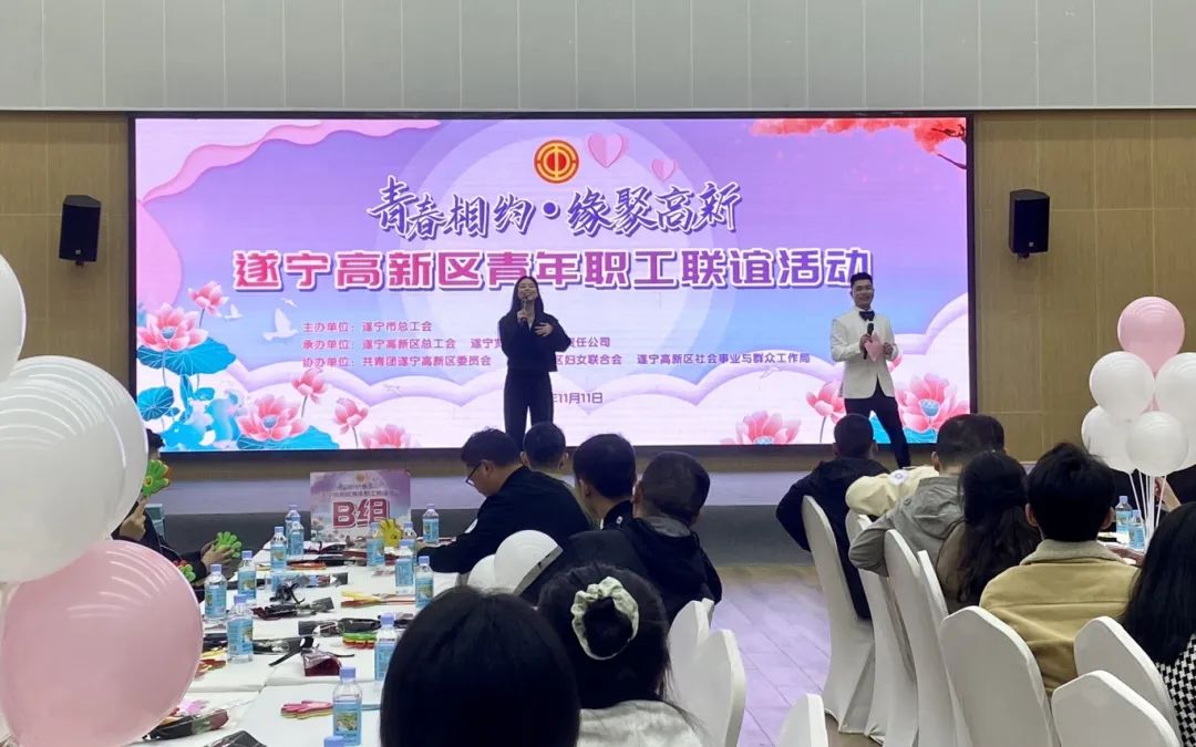 11月11日,由遂宁高新区总工会、团区委、区妇联、区社事群工局联合举办的“青春相约·缘聚高新”青年职工联谊活动在遂宁宽窄印务有限责任公司举行,来自全区的41个机关企事业单位90余名青年职工参加活动。