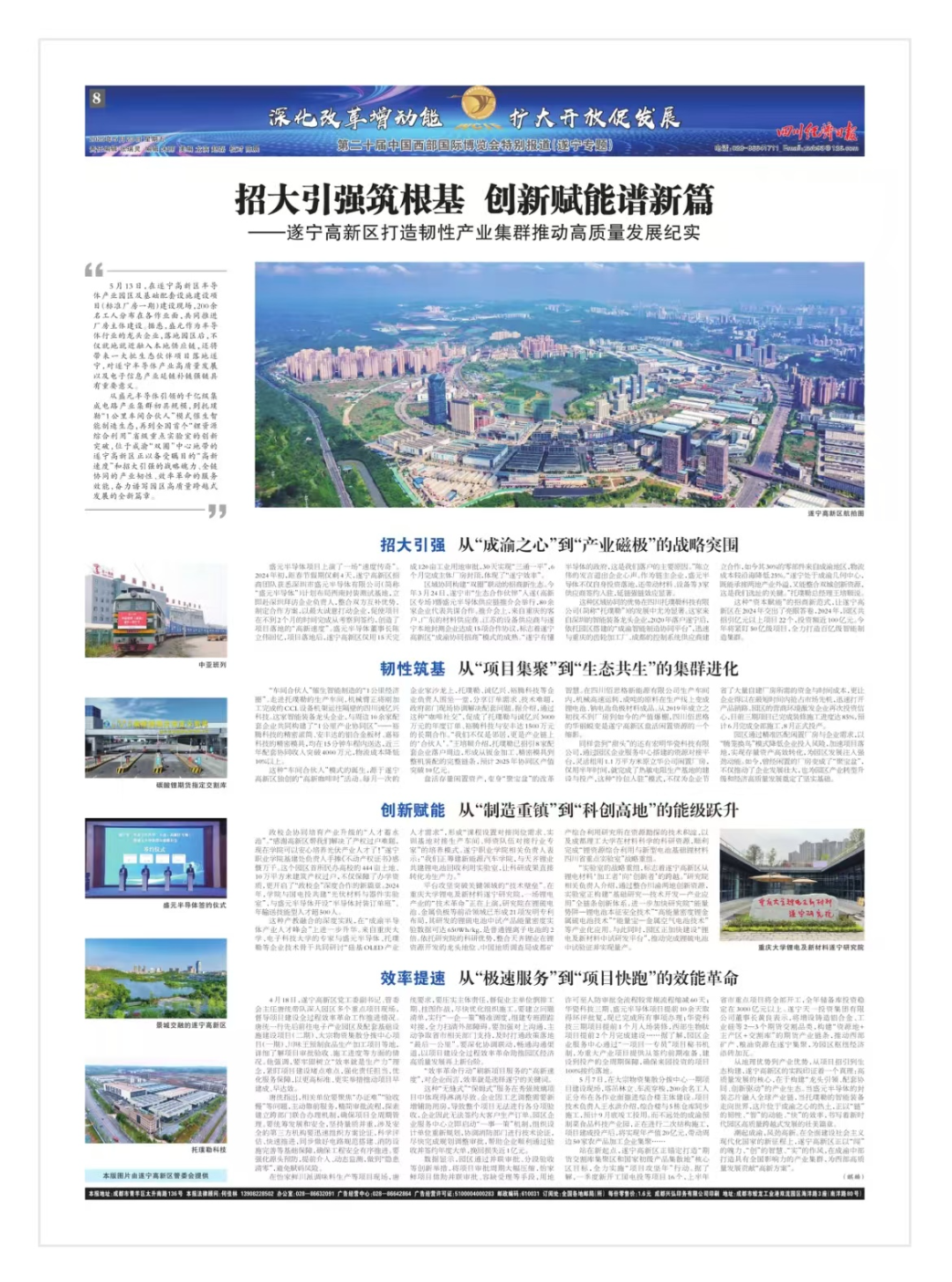 潮起成渝,风劲高新。在全面建设社会主义现代化国家的新征程上,遂宁高新区正以“闯”的魄力、“创”的智慧、“实”的作风,在成渝中部打造具有全国影响力的产业集群,为西部高质量发展贡献“高新方案”。