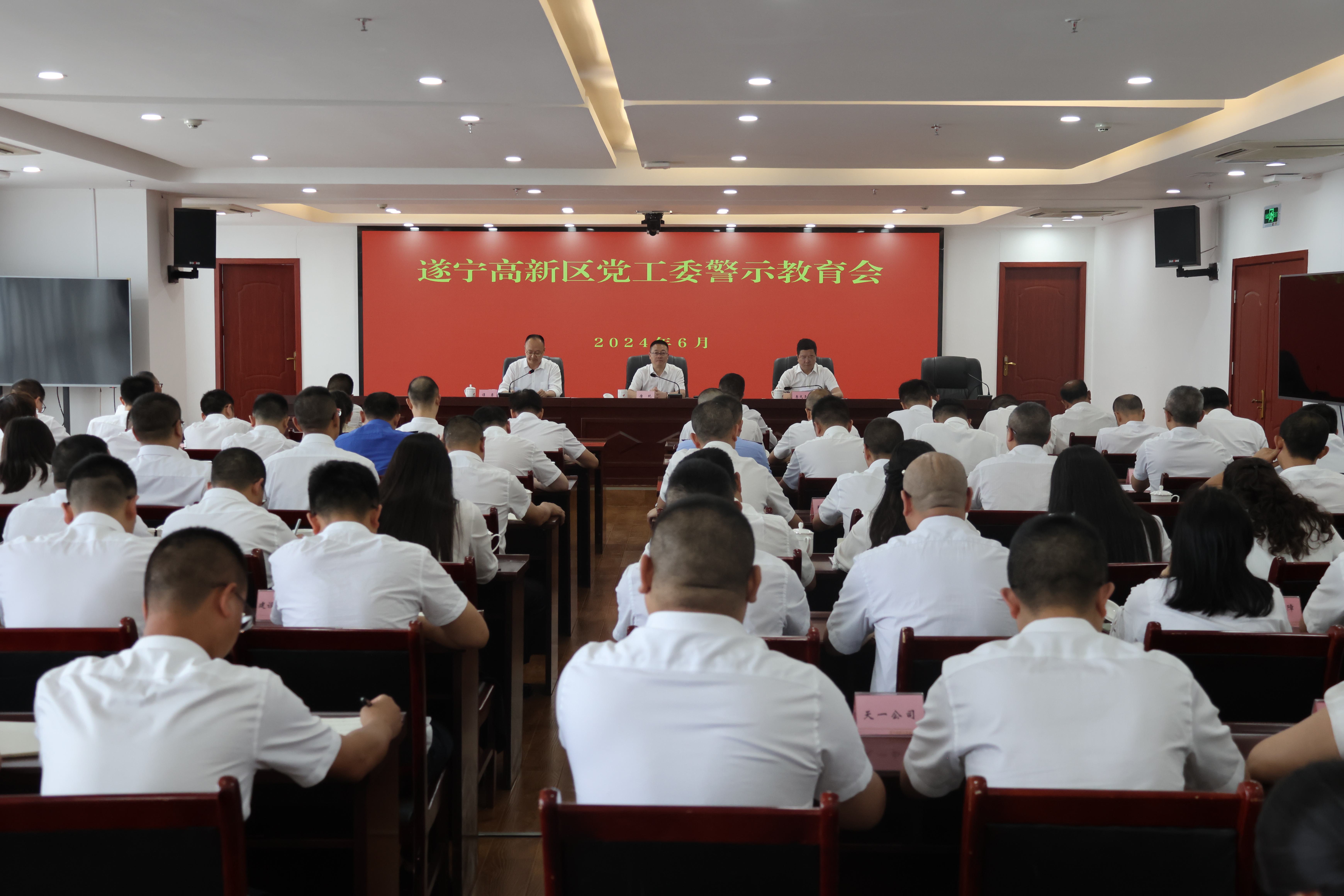 6月7日,遂宁高新区党工委召开警示教育会,对党工委、管委会领导,镇(街道)、委属各部门、直属各企事业单位、各派出机构主要负责同志等进行警示教育。遂宁高新区党工委副书记、管委会主任唐统主持会议并讲话,强调要将开展党纪学习教育同落实党中央决策部署和省委、市委工作要求结合起来,同推进省委巡视反馈问题、市委巡察反馈问题和各项审计反馈问题整改结合起来,同全区各项重点工作结合起来,切实将学习成果转化为推动工作的强大动力,以高质量党纪学习教育护航全区经济社会高质量发展。
