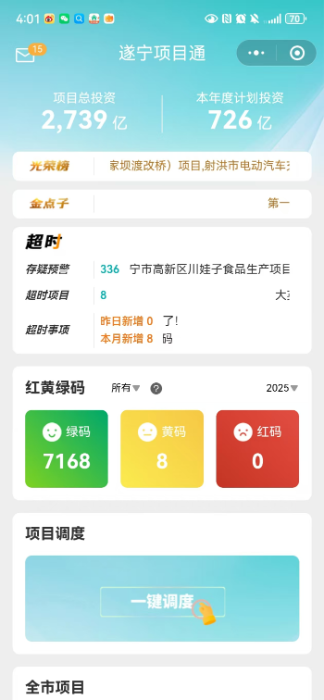 截至目前,“项目通”已填报市重点项目425个、项目储备7774个、招商签约项目523个。“我们还开展了‘光荣榜’‘金点子’等激励举措,推动项目建设提速提质。”黄海果说,接下来还将全面接入人工智能等工具,与城市大脑建设同步解锁“施工视频现场调度”“遥感影像对比分析”“项目打卡点赞”等功能。