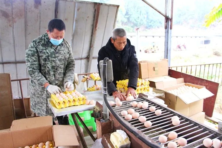 ▲遂宁高新区保升镇宝凤村“新农人”叶维成发展800余平方米的自动化养殖基地,年存栏产蛋鸡3万多只,年产蛋量1080万枚左右,产值可达700多万元。自动化设备赋能,基地实现自动上水、自动控温、自动上料、自动捡蛋。图为工人正在捡拾运输带上的鸡蛋。全媒体记者 梁惠/摄