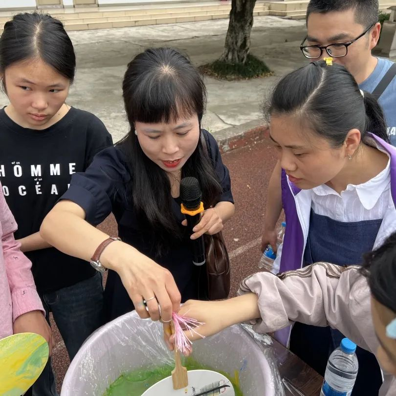 首场活动中,罗召莉带领两校学生共同体验非遗漆扇制作,孩子们通过混合分组,在“教师妈妈”的指导下设计图案、调配传统大漆,创作出融合两校文化元素的创意漆扇。