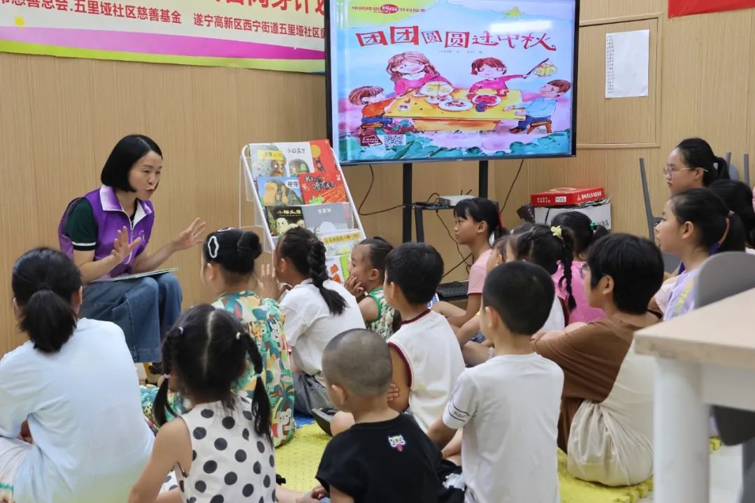 9月15日上午,在西宁街道五里垭社区的“五里乐活动站”内,十多个小朋友们围坐在一起,认真聆听着童伴妈妈声情并茂地给他们阅读《团团圆圆过中秋》绘本故事。