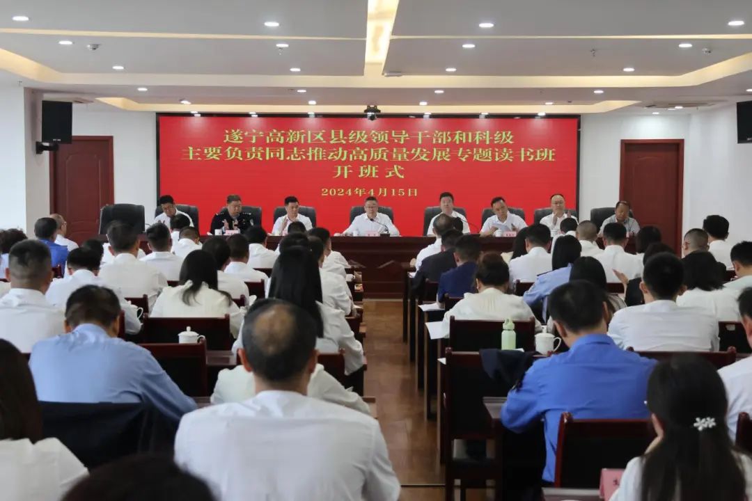 4月15日—18日,遂宁高新区举行县级领导干部和科级主要负责同志推动高质量发展专题读书班。遂宁高新区党工委副书记、管委会主任唐统作主题报告和结业讲话,强调要深入学习贯彻习近平总书记关于高质量发展的重要论述和对四川工作系列重要指示精神,进一步厘清发展思路、强化发展担当,不断提升发展“含新量”“含金量”“含绿量”,推动高新区经济社会高质量发展,为中国式现代化建设遂宁实践贡献更大高新力量。遂宁高新区党工委副书记、管委会常务副主任李戈亮主持会议。