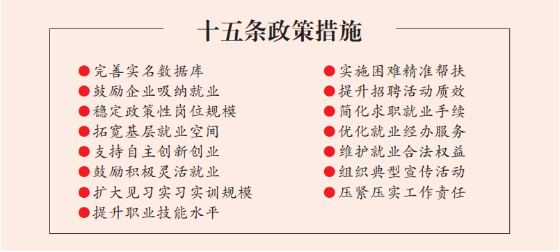 《措施》对完善离校未就业高校毕业生实名数据库建设进行了着重安排,要求运用线上登记、窗口服务、社区摸排等各类渠道,与离校未就业高校毕业生及失业青年普遍联系,同时大力宣传推广未就业毕业生求职登记小程序,允许未就业毕业生在户籍地、常住地、求职地进行失业登记或求职登记,建立完善离校未就业高校毕业生实名制数据库,摸清其就业失业状态、学历专业、求职意向、服务需求等信息,为有就业意愿的免费提供1次职业指导、3次岗位推荐、1次职业培训或就业见习机会。