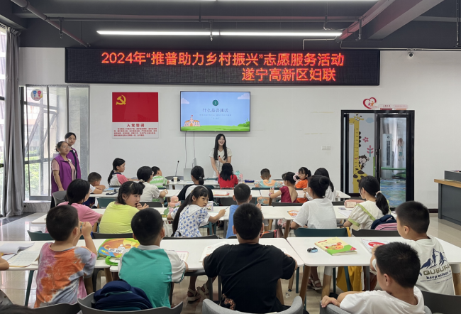 为深入贯彻落实党的二十大关于“加大国家通用语言文字推广力度”的决策部署,营造学习普通话的良好氛围。7月15日,遂宁高新区妇联在凉水井社区儿童之家组织开展“推普助力乡村振兴”志愿服务活动。园区30余名留守儿童及少数民族儿童参加活动。