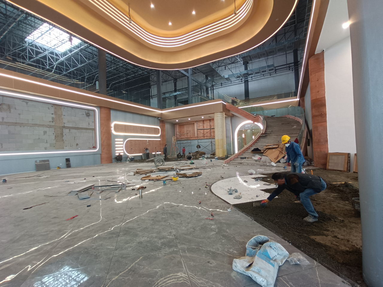 在高新国际影城建设现场,颇具现代化、简约风的影院大厅、观影厅等功能区域已基本成型,50余名工人按照施工要求,正有序进行地板安装、灯光装饰等,影院完工即将进入“倒计时”。