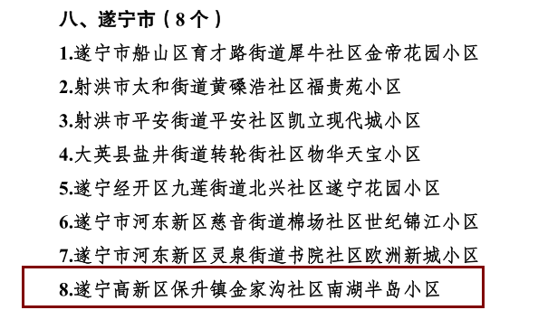 日前,中共四川省委城乡基层治理委员会办公室(简称“省委基层治理办”)下发《关于确定全省城市基层治理示范市、示范区和基层治理示范小区的通知》(以下简称《通知》),确定成都市等5市为全省城市基层治理示范市,成都市武侯区等15个区为全省城市基层治理示范区,成都天府新区华阳街道祥龙社区慕和南道小区等200个居民小区为全省基层治理示范小区。 遂宁高新区南湖半岛小区榜上有名 。 《通知》要求,各地要高度重视基层治理示范建设工作,切实加强组织领导,分层分类推进,加强工作支持,加强考核评估,确保示范体系建设有力有序推进。 全省基层治理示范小区名单