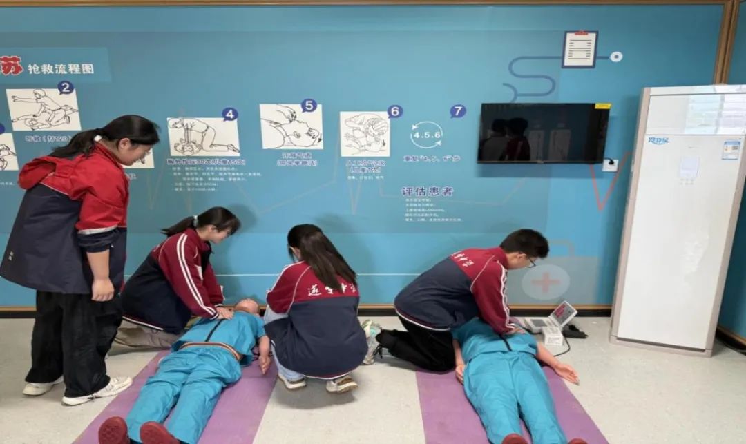 “请大家注意看我接下来的操作,双手交叠……”在宣传工作人员的指导下,学生们实操了心肺复苏抢救流程,体验了模拟触电等应急场景。