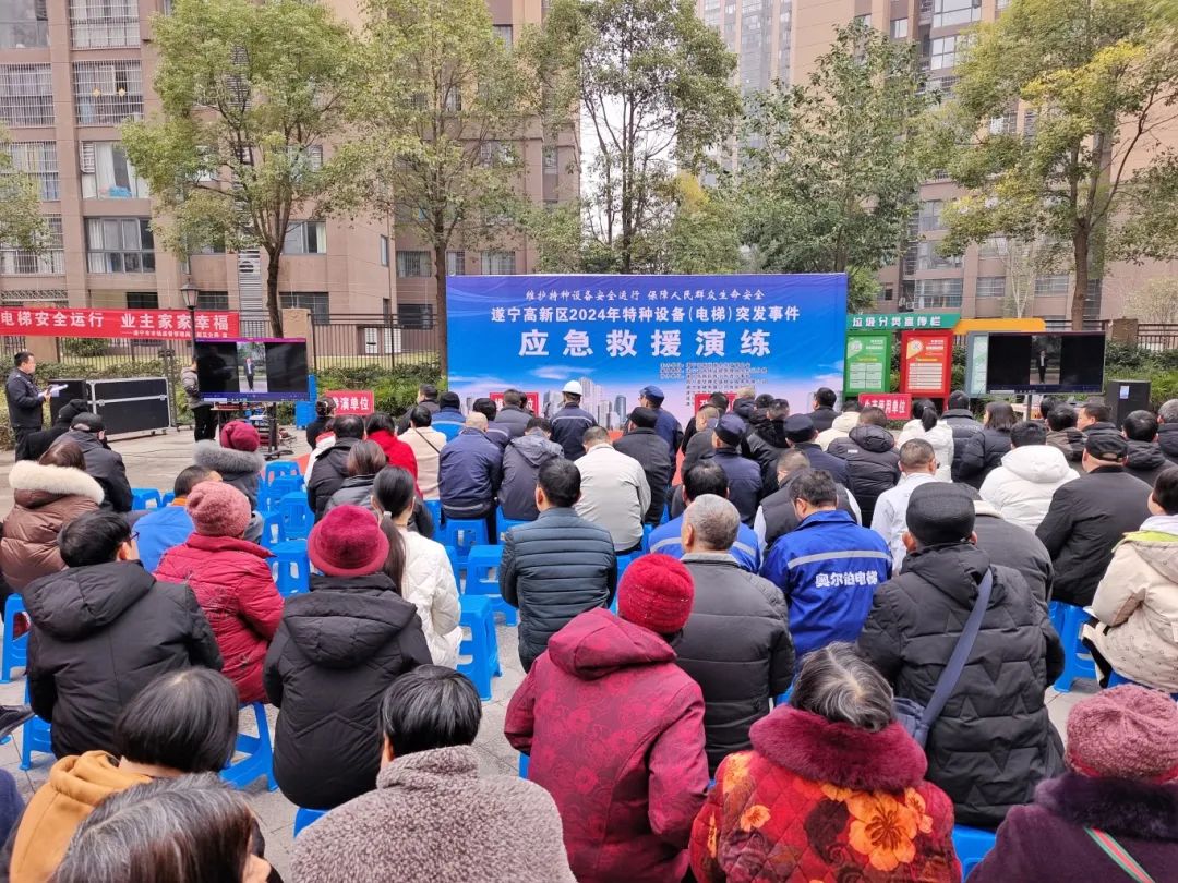为进一步落实“两项”工作机制,提高特种设备突发事件应急处置能力,增强居民特种设备使用安全意识,12月19日,遂宁高新区特种设备(电梯)突发事件应急救援演练活动在华翔城小区举行,此次活动由遂宁高新区安全生产委员会主办,遂宁高新区市场监管分局承办,主题为“维护特种设备安全运行,保障人民群众生命安全”。