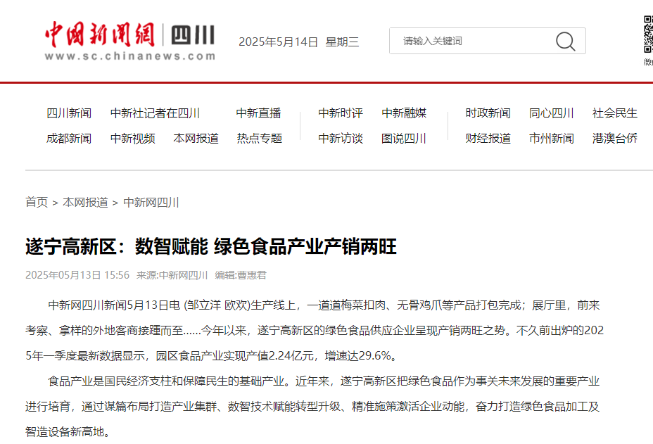 生产线上,一道道梅菜扣肉、无骨鸡爪等产品打包完成;展厅里,前来考察、拿样的外地客商接踵而至……今年以来,遂宁高新区的绿色食品供应企业呈现产销两旺之势。不久前出炉的2025年一季度最新数据显示,园区食品产业实现产值2.24亿元,增速达29.6%。