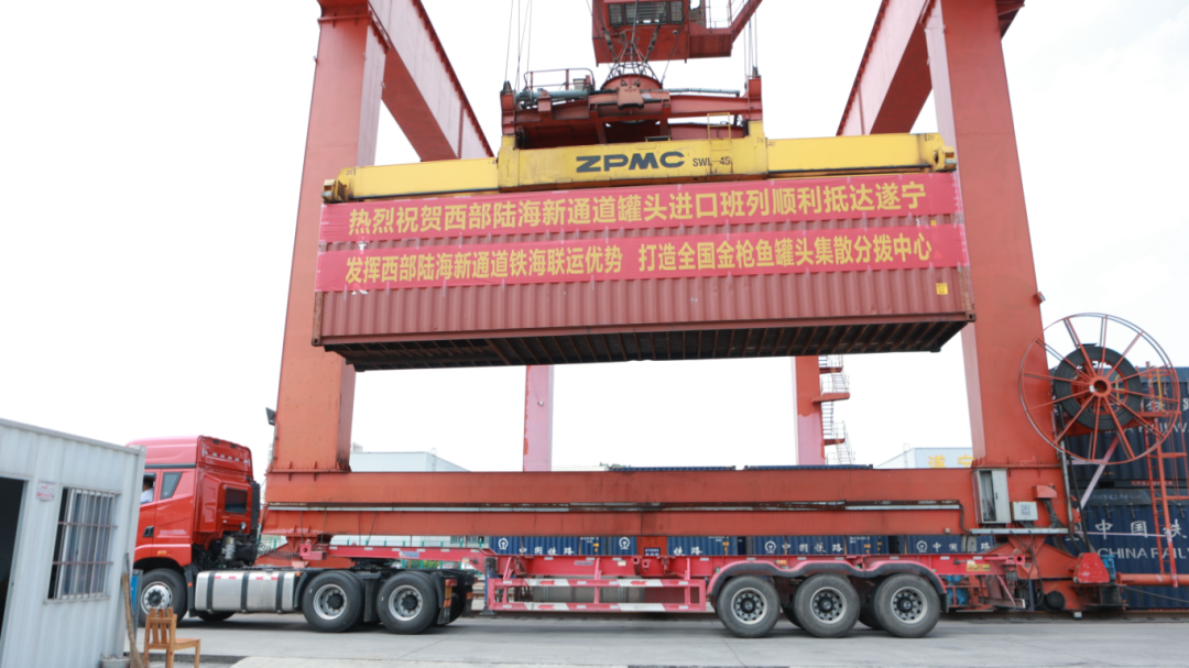 此次班列搭载10余吨金枪鱼罐头,自泰国林查班港出发,先海运至钦州港,而后在钦州港搭乘陆海新通道班列,通过铁路运输至遂宁高新区威斯腾西部铁路物流园,最终换乘公路运输转驳至四川晨羿克公用型保税仓库入库开展保税仓储,成功完成了“公、海、铁”联运一箱到底操作。