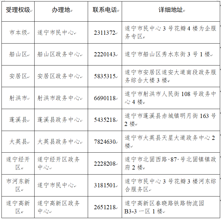 2.遂宁市各级登记机关窗口地址及咨询电话(详见下表)。