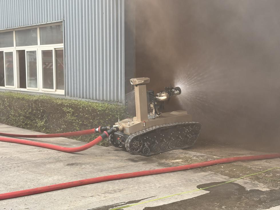 紧跟其后,随着两声模拟爆裂声响起,现场指挥官发出指令:“建筑出现爆炸坍塌,所有人员立即撤离到安全地带!”演练队伍有序撤离的同时,防爆侦察灭火机器人沿着预设路线突进,在消防队员操控下,机器人在障碍区域灵活调整喷射角度喷水。“防爆侦察灭火机器人具备探测6种有毒气体的功能,水炮最大流量达80L/s,能旋转、俯仰80°实现全方位灭火,自带热成像仪、前端避障等功能,可在黑暗环境下精准寻找火点。在灭火救援现场,机器人传回的热源分布图,将为指挥部决策提供关键依据。”现场指挥官介绍。