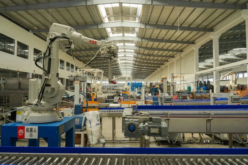 在四川美宁食品有限公司肉类罐头智能化加工基地,机器人进行罐头空罐包装作业。张莹 摄