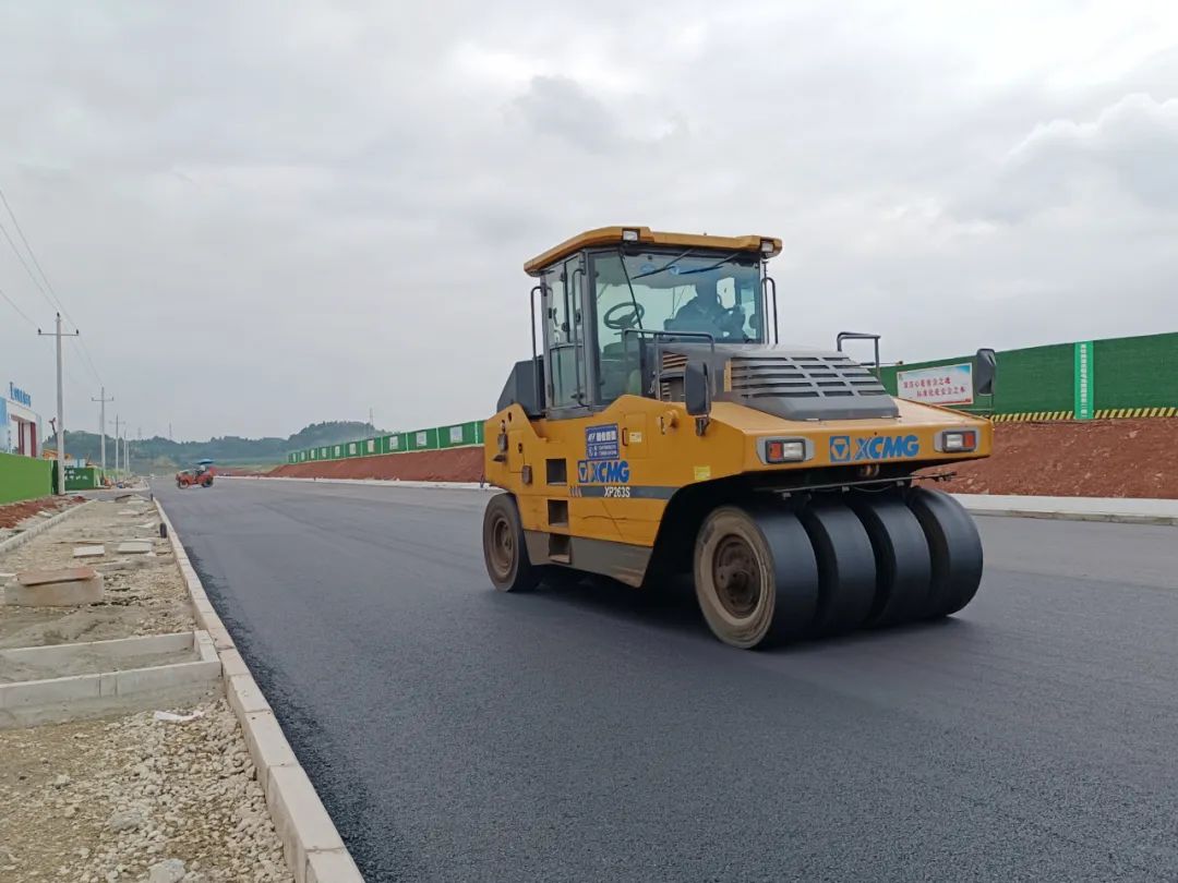 近日,走进遂宁高新区锂电产业园配套基础设施(一期)项目建设现场,施工人员热情高涨,大型机械设备有序作业,一派火热景象。在匀速前进的大型摊铺机后面,三台压路机隆隆作响,来回碾压于刚摊铺的沥青砼层。随着最后一车沥青混凝土拌合料缓缓倾倒入摊铺机,横十路和纵十三路延长线的第二层沥青砼铺设即将收尾。