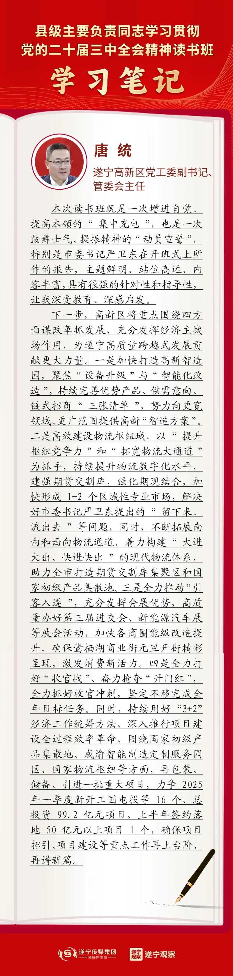 下一步,高新区将重点围绕四方面谋改革抓发展,充分发挥经济主战场作用,为遂宁高质量跨越式发展贡献更大力量。一是加快打造高新智造园,聚焦“设备升级”与“智能化改造”,持续完善优势产品、供需意向、链式招商“三张清单”,努力向更宽领域、更广范围提供高新“智造方案”。二是高效建设物流枢纽城,以“提升枢纽竞争力”和“拓宽物流大通道”为抓手,持续提升物流数字化水平,建强期货交割库,强化期现结合,加快形成1-2个区域性专业市场,解决好市委书记严卫东提出的“留下来、流出去”等问题,同时,不断拓展南向和西向物流通道,着力构建“大进大出、快进快出”的现代物流体系,助力全市打造期货交割库集聚区和国家初级产品集散地。三是全力推动“引客入遂”,充分发挥会展优势,高质量办好第三届进交会、新能源汽车展等展会活动,加快各商圈能级改造提升,确保鹭栖湖商业街元旦开街精彩呈现,激发消费新活力。四是全力打好“收官战”、奋力抢夺“开门红”,全力抓好收官冲刺,坚定不移完成全年目标任务。同时,持续用好“3+2”地方经济工作统筹方法,深入推行项目建设全过程效率革命,围绕国家初级产品集散地、成渝智能制造定制服务园区、国家物流枢纽等方面,再包装、储备、引进一批重大项目,力争2025年一季度新开工国电投等16个、总投资99.2亿元项目,上半年签约落地50亿元以上项目1个,确保项目招引、项目建设等重点工作再上台阶、再谱新篇。