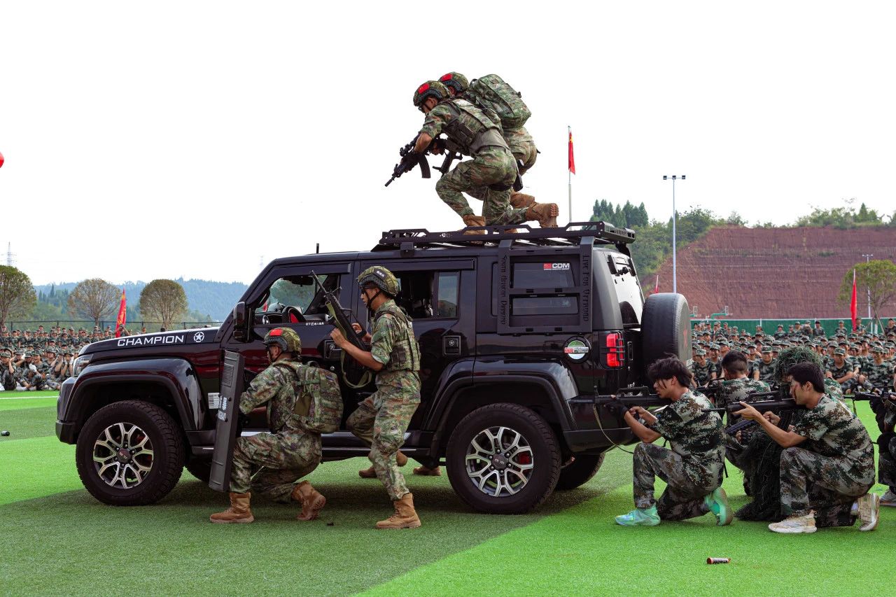 仪式第一项,全体军训连队迎旗仪式。护旗队伴着铿锵的乐曲,迈着坚定有力的步伐向同学们走来,烈日当空,映衬着旗帜的鲜艳,全体师生和教官,庄严肃立,行注目礼。分列式、数字方阵、军体拳、刺杀方队、擒敌拳、匕首操表演、战地救护、搏击对抗、警棍盾牌术、战术表演一招一式,刚劲有力,动作娴熟,节奏分明,力量与美感相得益彰,充分展现了军训的良好成果,也展示了遂职学子斗志昂扬、意气风发的青春风貌。