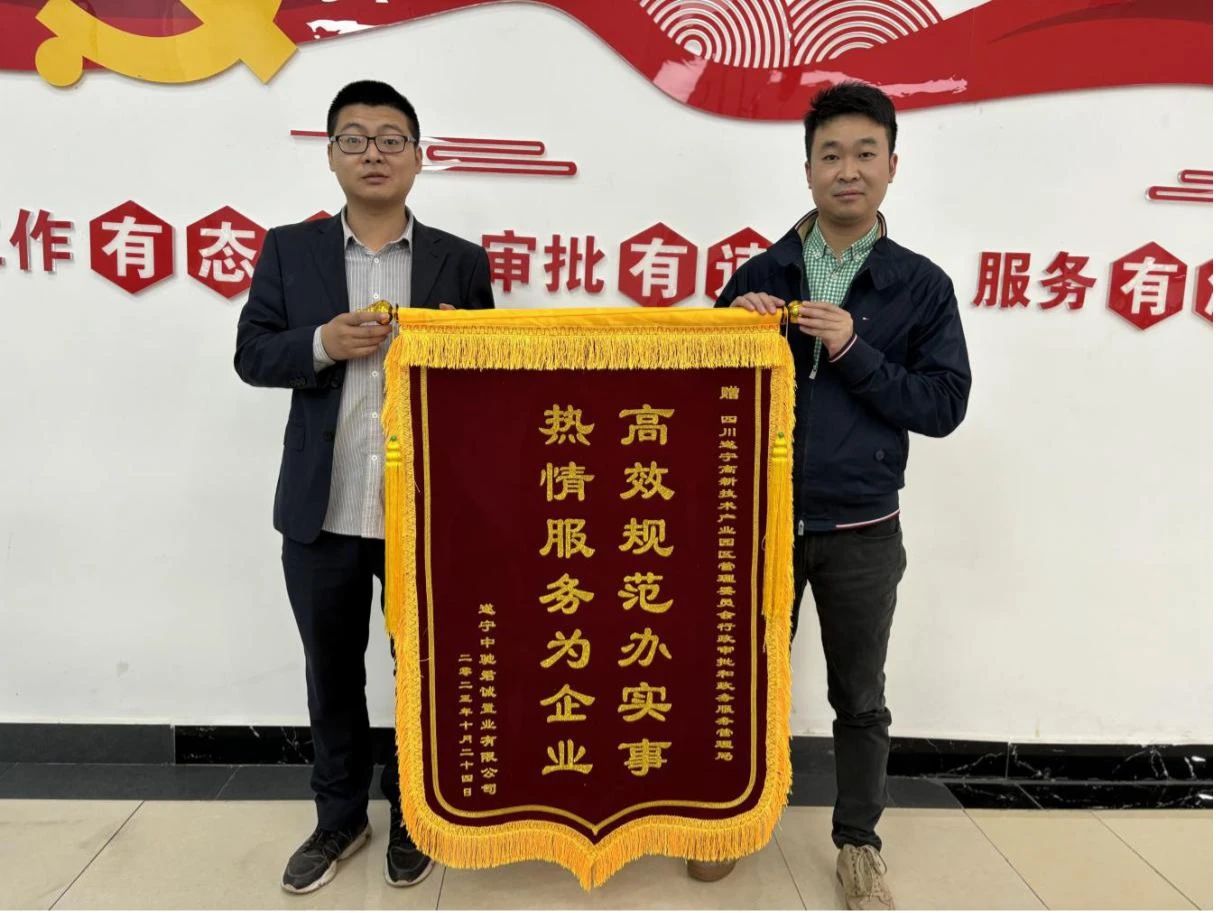 近日,遂宁中驰君诚置业有限公司(中驰鹭栖台项目)负责人将一面印着“高效规范办实事 热情服务为企业”的锦旗送至遂宁高新区行政审批政务服务局经济建设窗口,诚挚感谢工作人员热情周到、方便快捷的服务。