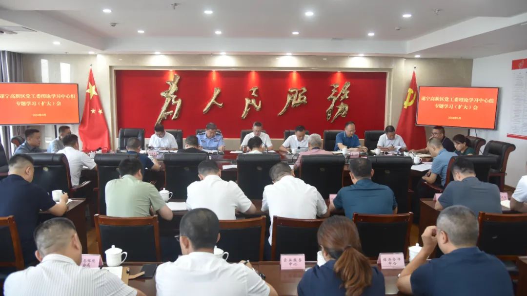 9月12日,遂宁高新区党工委理论学习中心组专题学习(扩大)会召开,集中学习党的二十届三中全会精神。遂宁高新区党工委副书记、管委会主任唐统主持会议并讲话。园区领导黄俊宁、赵武军、谭勇、冉茂连、李忠海参加会议。