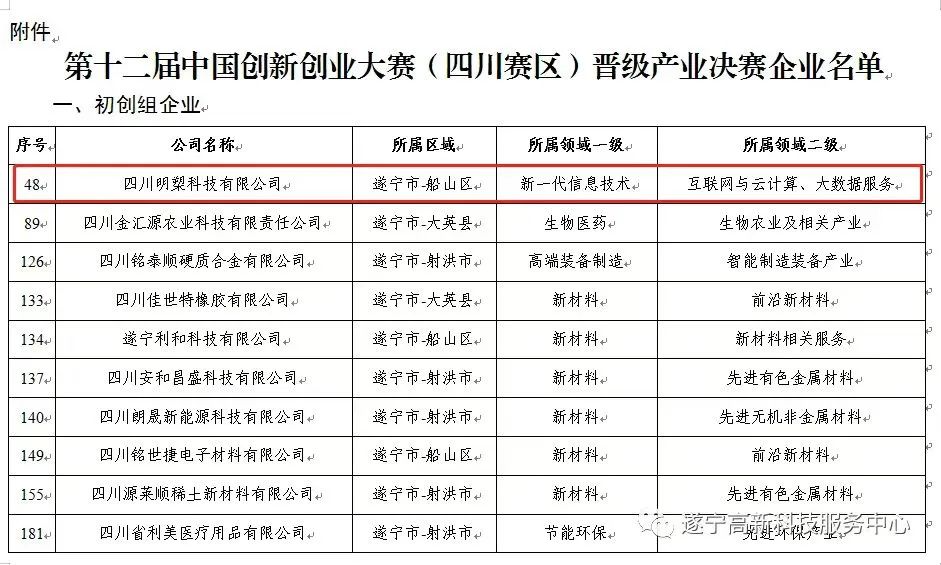 近日,四川省科技厅网站公布第十二届中国创新创业大赛(四川赛区)晋级产业决赛企业名单。我市铭世捷电子、利和科技、朗晟新能源、明槊科技(位于遂宁高新区)等10家企业获得决赛资格。