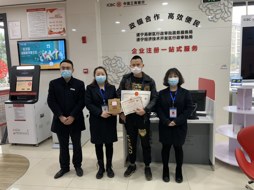 2月3日,在工商银行遂宁工业园区支行,四川佳源新商贸有限公司负责人李先生成功领取遂宁高新区颁发的首张“政银合作”营业执照。“原来办理营业执照这么方便,附近的工商银行也能办了,还能免费刻制印章并送章上门,既快捷又方便!”接过营业执照,李先生激动地说道。