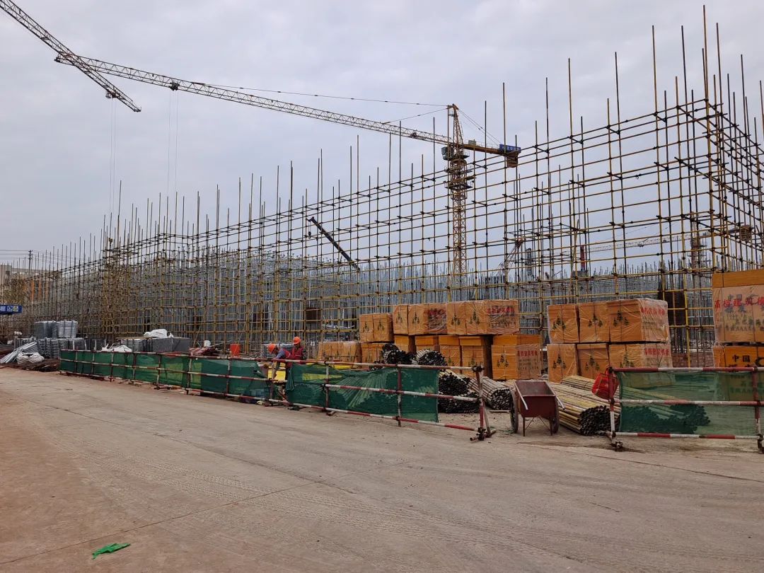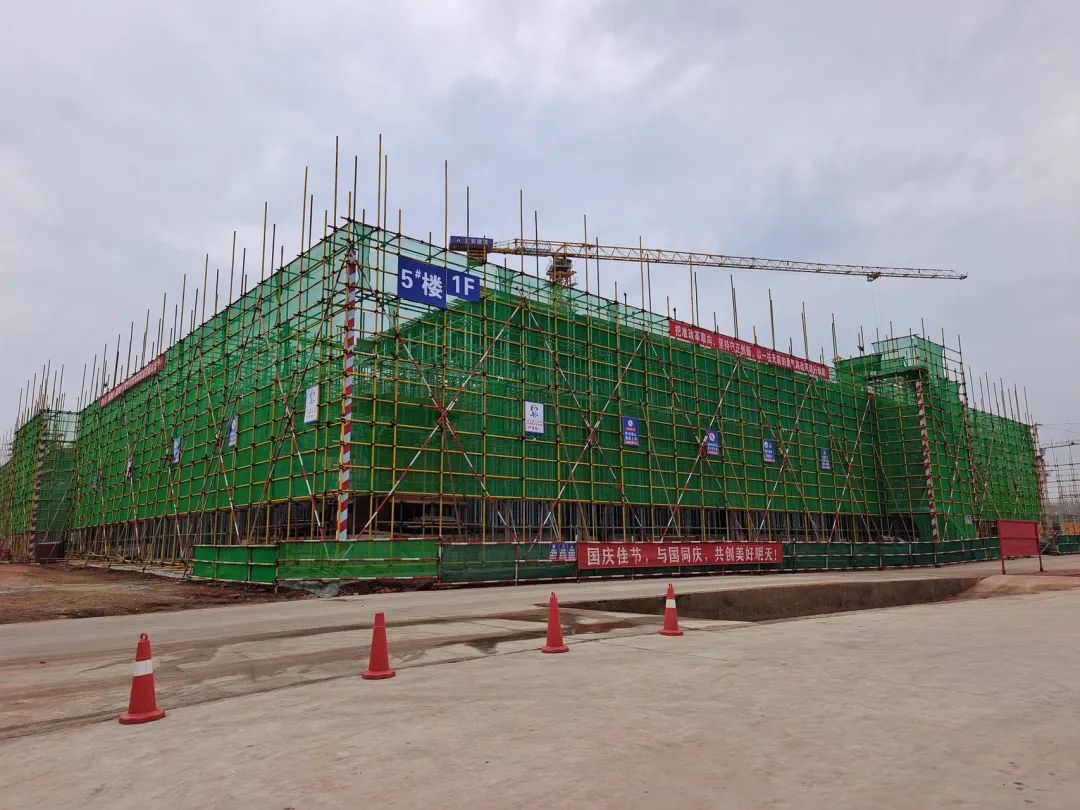 建设过程中,由于项目生产厂房层高较高,一层层高可达8.5米左右,属于高支模项目,深基坑达5.5米,属于超危大工程,内架搭设困难,方案需要专家论证后才能实施。为抢抓工期,项目方采用4号楼、5号楼共同施工的措施,搭设过程中同时投入4000吨的盘扣架材料,较传统脚手架整体性更好,安全性高,施工方正加班加点抢工期、赶进度。