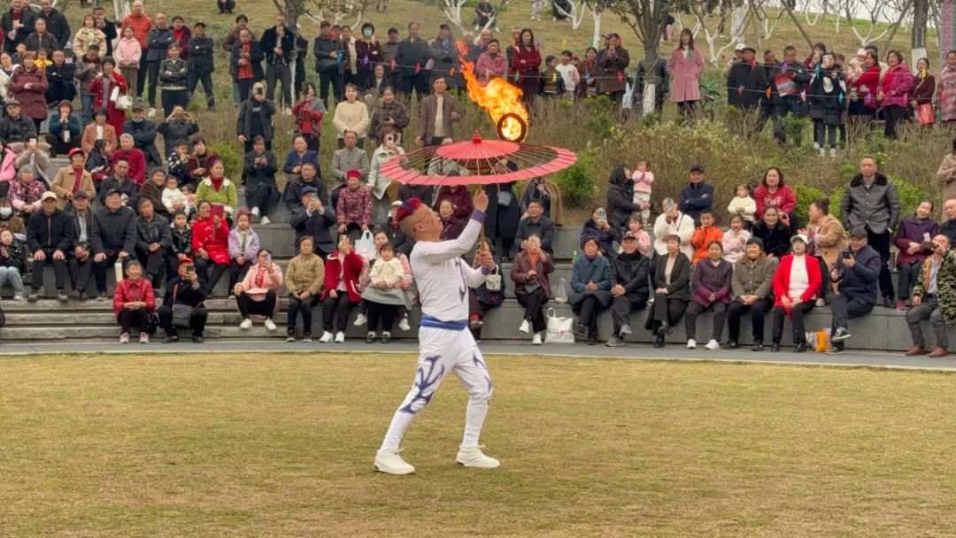 上午10点,开幕式在悠扬乐曲中拉开帷幕,一场融合传统美学与现代技艺的文艺演出点燃全场,舞者们身着粉色纱裙,以柔美身姿演绎诗意画卷,为市民游客带来有声有色的“视听盛宴”。杂技演员带来的纸伞滚球节目惊险吸睛,在旋转的油纸伞上精准操控滚动火球,引得观众连连喝彩。小丑互动秀更是将气氛推向高潮,滑稽装扮与漫天飞舞的气球让孩子们欢呼雀跃,竞相上前互动,现场氛围火爆。