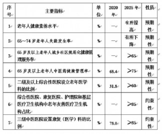 《规划》明确,到2025年,65岁及以上老年人城乡社区规范化健康管理服务率达到65%以上,65岁及以上老年人中医药健康管理率达到75%以上;三级中医医院设置康复(医学)科的比例达到85%以上;85%以上的综合性医院、康复医院、护理院和基层医疗卫生机构成为老年友善医疗机构;培训老年医学科医师不低于2万人,培训老年护理专业护士不低于1万人,每名老年医学科医护人员、安宁疗护试点地区从事安宁疗护服务的医护人员至少接受一次专业培训。
