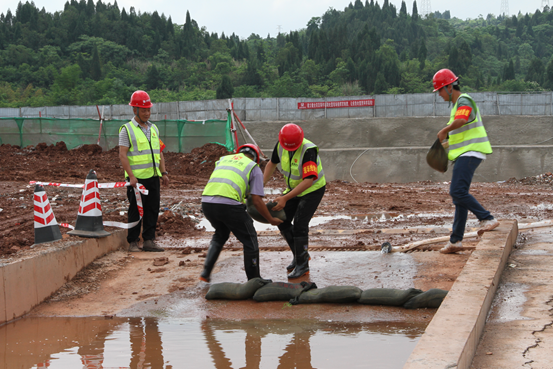 5月-9月是汛期高发期,为积累应对经验,现场还开展了防洪防汛应急演练。模拟场景中,突降暴雨致使施工现场积水快速漫过警戒线,基坑安全面临严重威胁。施工现场项目经理谭毅当即下达指令:“立即启动防汛一级响应!”后勤保障组迅速调配防汛物资;警戒疏散组快速对危险区域实施警戒;现场抢险组争分夺秒搬运沙袋,在基坑周边构筑临时挡水墙,并启动大功率抽水泵全力排水。