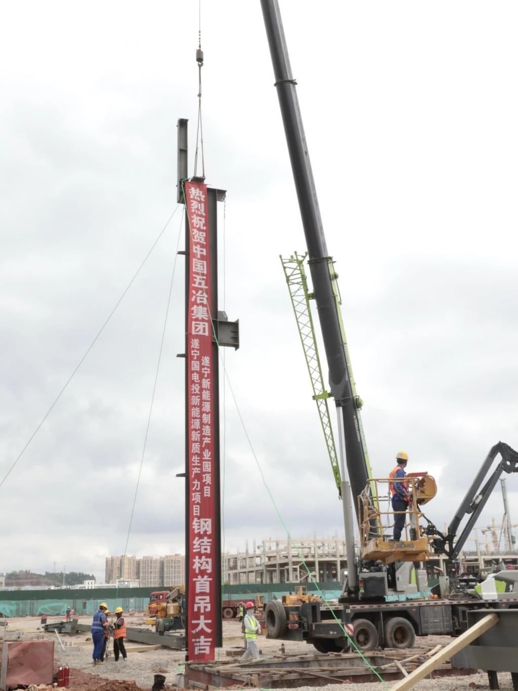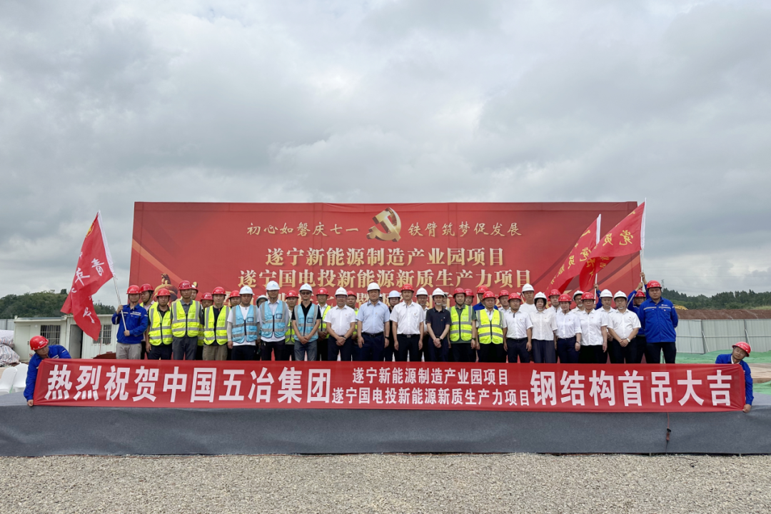 初心如磐庆“七一”,铁臂筑梦促发展。在中国共产党成立104周年之际,7月1日,天盈公司联合中国五冶集团在遂宁国电投新能源新质生产力项目举行誓师攻坚庆“七一”暨钢结构首吊启动仪式。随着首根钢结构在9点58分精准吊装就位,标志着这一总投资50亿元的重点项目正式迈入主体施工阶段。