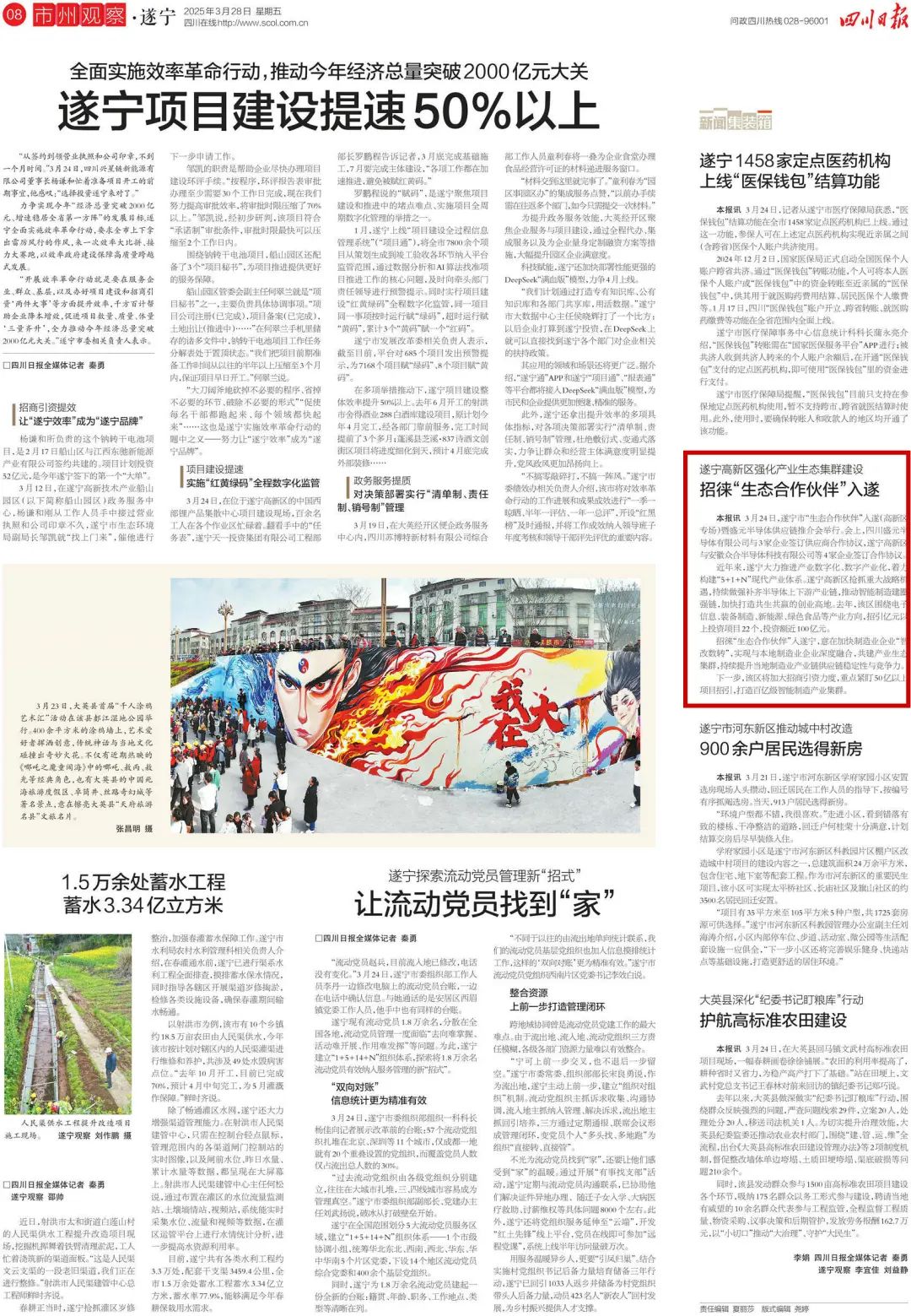 近年来,遂宁大力推进产业数字化、数字产业化,着力构建“5+1+N”现代产业体系。遂宁高新区抢抓重大战略机遇,持续做强补齐半导体上下游产业链,推动智能制造建圈强链,加快打造共生共赢的创业高地。去年,该区围绕电子信息、装备制造、新能源、绿色食品等产业方向,招引亿元以上投资项目22个,投资额近100亿元。招徕”生态合作伙伴”入遂宁,意在加快制造业企业”智改数转”,实现与本地制造业企业深度融合,共建产业生态集群,持续提升当地制造业产业链供应链稳定性与竞争力。