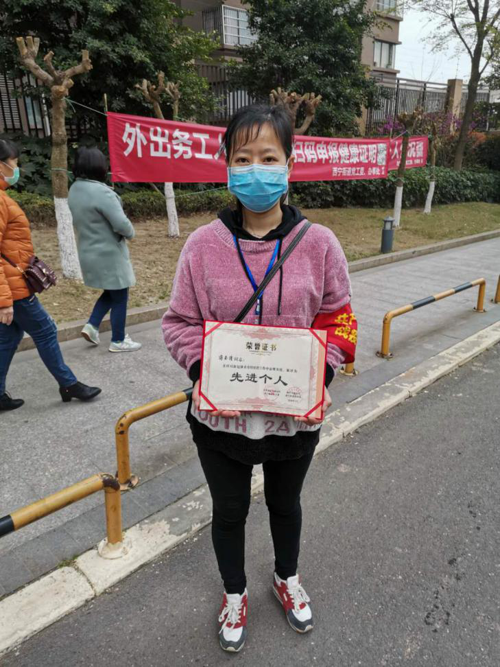 第二张照片是志愿者蒋玉清,她的主要工作是在华翔城街面进行巡街劝导工作。因五里垭社区辖区面积大,居住人口多,企业多,居家隔离户多,蒋玉清好多时候都要加班到晚上10点多钟。有一次她6岁的女儿晚上9点给她打电话:"妈妈!你怎么还没回来呀?我想你!"她回答到:"柒柒,妈妈还未做完,做完就回来,你先睡,听话。"随后果断的挂断电话,继续工作。又过了一个小时,她6岁的女儿又给她打电话:"妈妈,你什么时候回来呀?我想你,我睡不着,你快回来吧。"她温柔的回答到:"好的柒柒,妈妈把这点工作做完就回来,你先睡好不好?"挂断电话,她加紧工作,等终于做完资料,时间已是晚上10点20。她总是乐观地笑着对我说:"强哥,如果今天的事情未做完,心里总觉得不踏实,不自在,只有做完了,心里才舒服。"