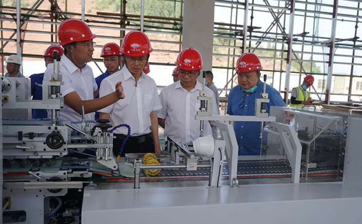 在工人的齐心努力下,办公大楼以一天一个样的速度"成长"起来。目前,主体工程已初具规模,正在进行屋面及外立面结构施工;已完成建设的复合车间里,中烟印刷包装产能项目的首条生产线在设备调式完毕后开始试生产。