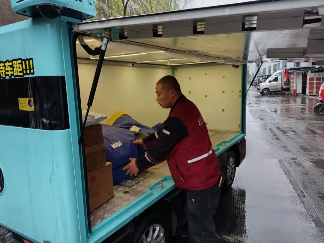 到达目的地后,快递驿站工作人员在听到"车辆已到达,请及时取货"的语音提示后,迅速完成扫码、卸货、关门等操作,顺利完成配送任务。