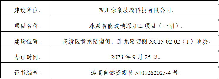 关于办理泳泉智能玻璃深加工项目(一期)项目建设工程规划条件核实(土地核验)合格证的公示