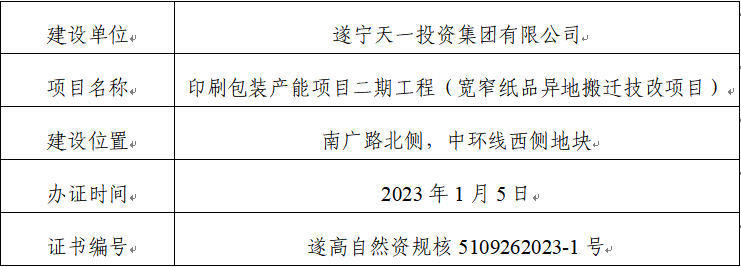 关于办理印刷包装产能项目二期工程(宽窄纸品异地搬迁技改项目)建设工程规划条件核实(土地核验)合格证的公示